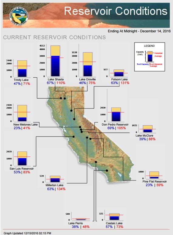 As I am writing, it is POURING RAIN here in Napa and there is a Flash Flood warning. During this time last year, ZERO of the major California Reservoirs were at their Historical Average levels. Today, things look a bit better with Shasta, Folsom, Don Pedro, and Millerton above their Historical Averages according to the Ca Dept of Water Resources.