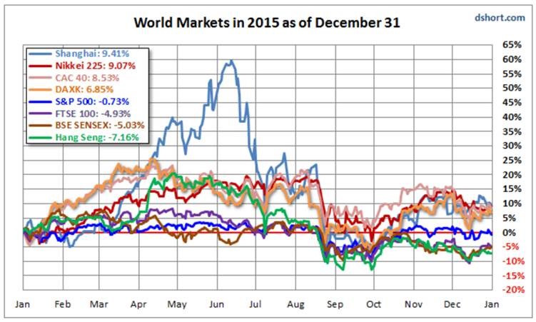 In 2015, global stock market returns were led by China. I can’t believe I just said that. The media like to jump on China’s epic decline from June-September, but remember that was after a +60% run-up the first half of the year. Check out the Light Blue line in the chart below. If it makes you feel any better, China’s gains were short-lived; the Shanghai market gave up all those gains by January 8th 2016. There is so much to say about China’s economy, but let me leave you with one fact that helped me understand why the Chinese stock market is so unruly. It’s only 25 years old. By comparison, the Dow Jones Industrial Average was 25 years old in 1921. The 1920’s were not exactly a beacon of calm & sustainable markets in the USA. Otherwise, last year Japan, France, and Germany posted gains. The US was basically flat, UK down almost -5%, India down -5%, and Hong Kong down -7%. Emerging markets were down about -14% according to JP Morgan.