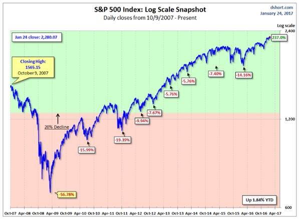 Speaking of financial optimism, this week the Dow Jones reached a major milestone - it closed above 20,000 for first time. It is natural to think “we are at an all-time high… is it time to sell?” In many ways it should be a time to sell. This is the longest that the S&P has gone without a 5% pullback since 2009, there is policy “uncertainty” with the new Presidential administration, interest rates are going up, and there is generally slowing economic growth.